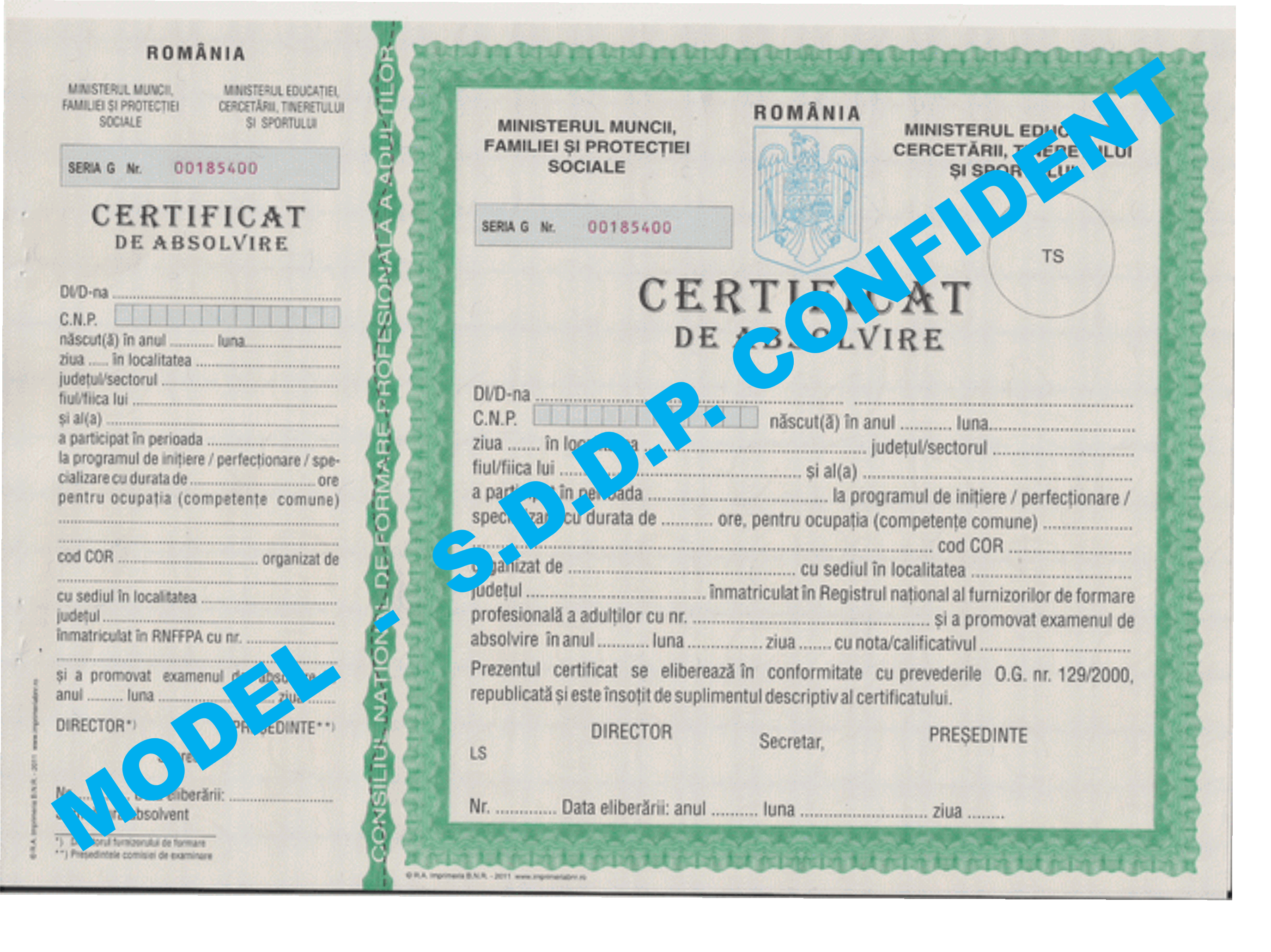 După parcurgerea examenului de absolvire, participanţilor declaraţi reuşiţi li se eliberează CERTIFICATE DE ABSOLVIRE, cu recunoaştere naţională, imprimate-tip, având elemente de securizare, tipărite pe hârtie specială şi poartă antetul Ministerului Muncii, Familiei şi Protecţiei Sociale şi al Ministerului Educaţiei, Cercetării, Tineretului şi Sportului şi au regimul actelor de studii. Aceste Certificate de absolvire, traduse şi apostilate, sunt recunoscute oficial şi în alte ţări din Uniunea Europeană!.