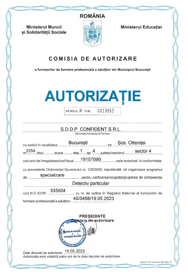 SCOALA DE DETECTIVI PARTICULARI „CONFIDENT”, este reautorizata cu AUTORIZATIA SERIA B NR. 0013952, prin Decizia nr. 3468 din 19.05.2023, eliberata de Comisia de autorizare a furnizorilor de formare profesionala a adultilor din Municipiul Bucuresti, sub autoritatea Ministerului Muncii si a Ministerului Educatiei, cu activitatea principala: Alte forme de invatamant-cod CAEN 8559.